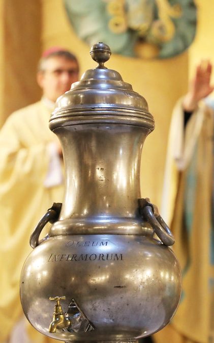 Ce sacrement (autrefois appelé Extrême onction) s’adresse aux personnes malades ou souffrantes. Par l’onction de cette huile sainte, la personne qui le reçoit est accompagné par le Christ dans son épreuve.